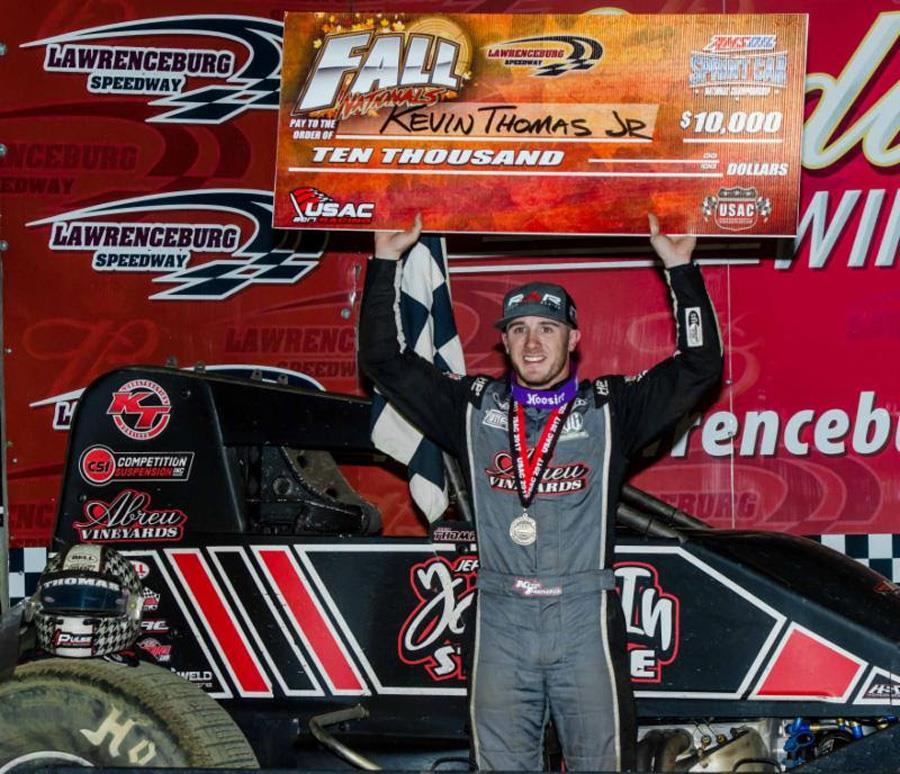 By Richie Murray, USAC Media (Lawrenceburg, IN) -- Kevin Thomas, Jr. made all the right moves in Saturday night's Lawrenceburg Speedway "Fall Nationals," becoming $10,000 richer with a flawless drive for his fourth USAC AMSOIL National Sprint Car points win of the season.